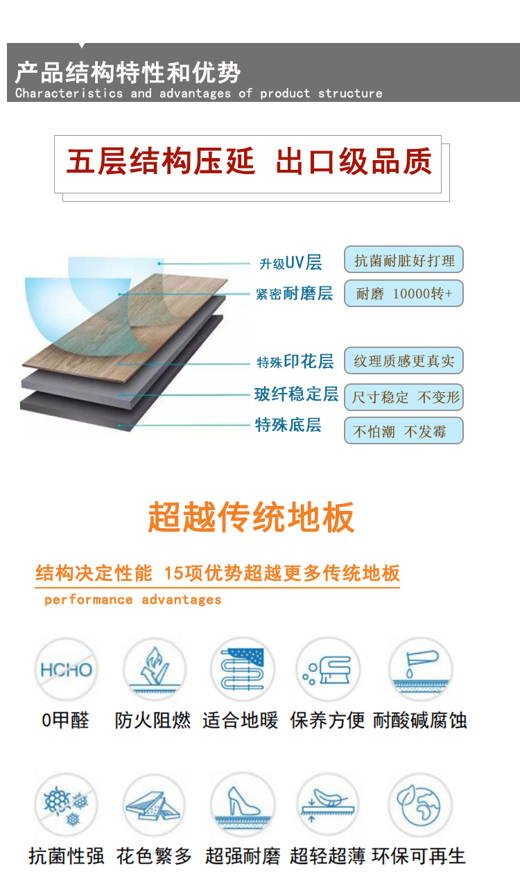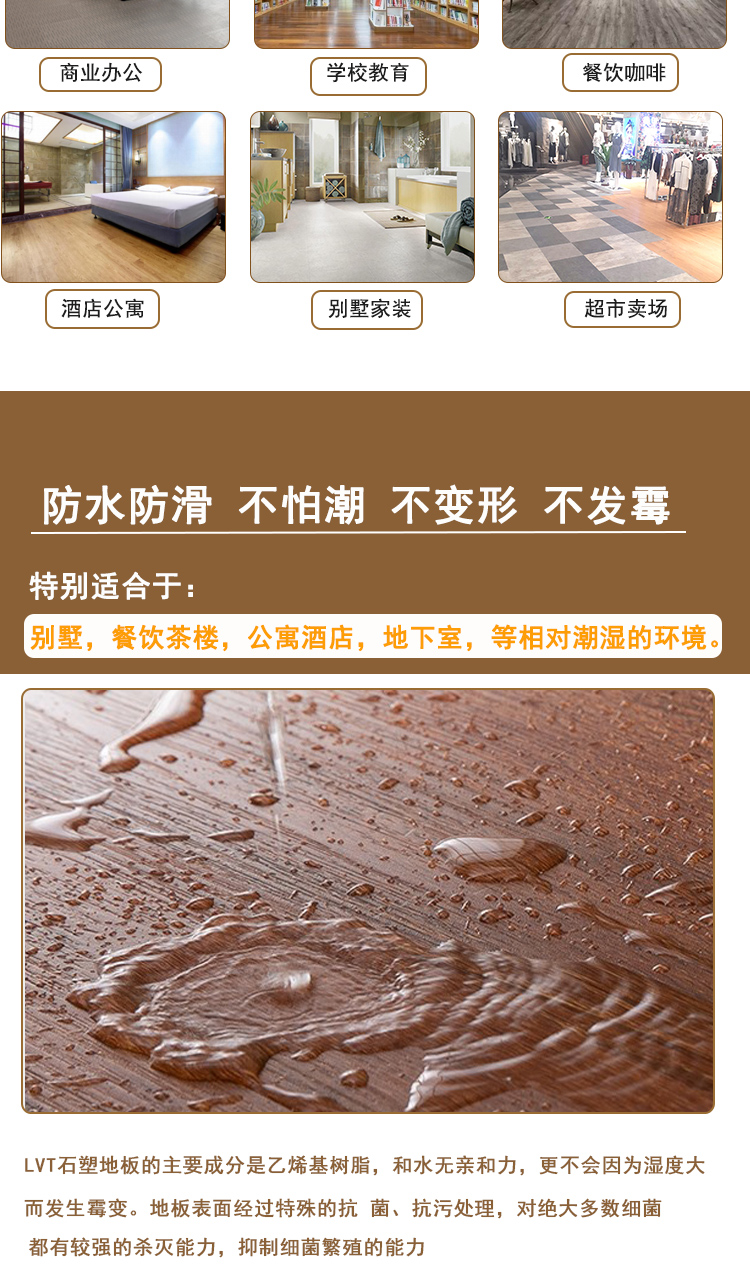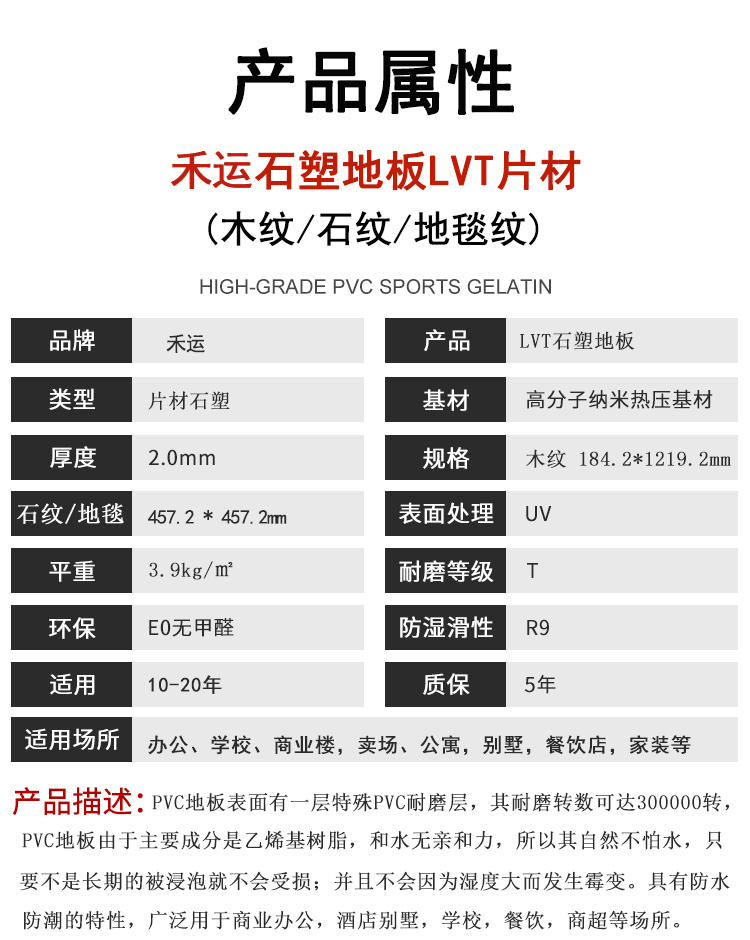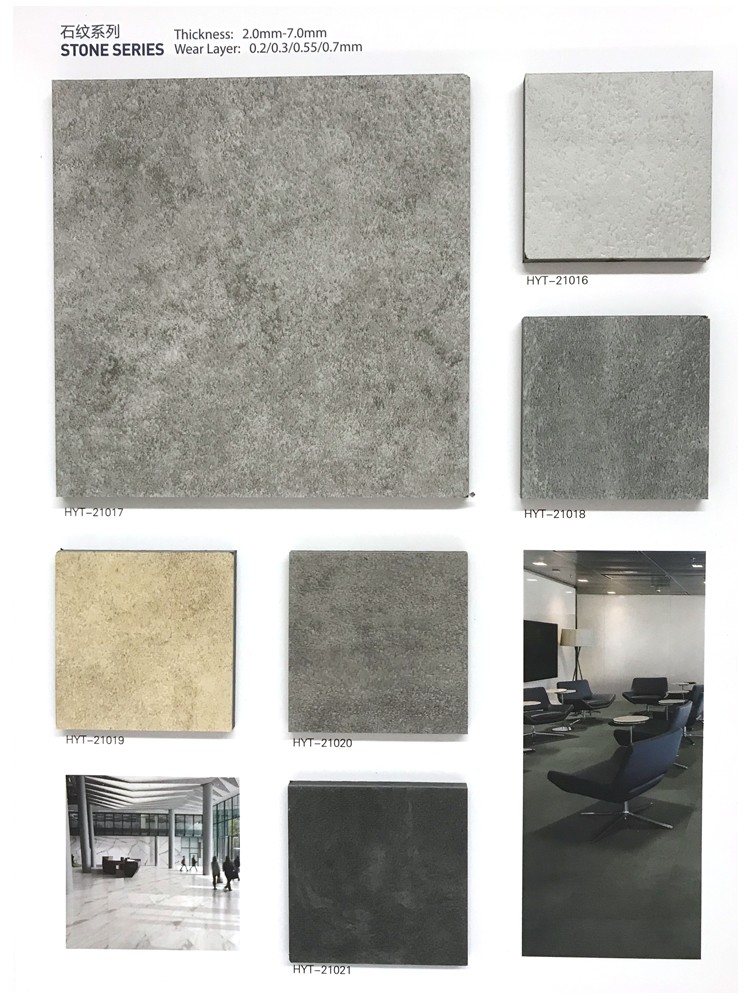 介紹:PVC石塑地板即LVT石塑地板,指的是PVC片材地板,因為PVC片材地板主要原料是天然石粉,耐磨層是PVC材質,因 此起名叫“石塑地板”或“石塑地磚”。 花紋分為仿木紋,仿石紋,仿地毯紋,環保耐磨,防水防滑,防火阻燃,花紋眾多,可塑性強,安裝快速方便等優勢,已經替代了市場上很大部分強化木地板。